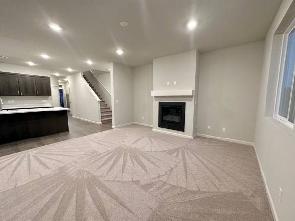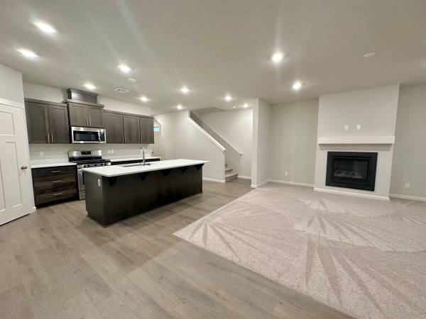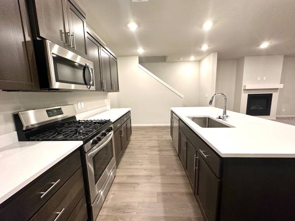 The main level features 9-foot ceilings, a bright open kitchen with quartz countertops, island, walk-in pantry, and all stainless steel appliances included. The living room offers a cozy gas fireplace, and the covered patio opens to a fully fenced, landscaped backyard with underground sprinklers front and back.