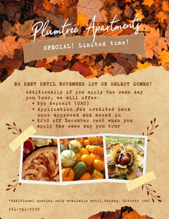 If you're looking to upgrade your lifestyle and personal service from a management company you can trust, you've come to the right place. At Plumtree Apartments we’ll give you the attention and personal service you need every day! We are close to local shopping, restaurants, entertainment, and more! Every unit has warm color schemes and stainless steel appliances. Residents can take advantage of our seasonal swimming pool and dog stations at this pet-friendly, limited smoking community. You will find beautiful features and amenities like modern, open floor plans, granite countertops in select units, stainless steel appliances, dining space and bar style countertops. A/C units, full-size washer, and dryer, walk-in closets in select units, garbage disposal, dishwasher, built-in microwave, ice makers in select units and personal storage on back deck/patio. Each apartment comes with one assigned parking space. All 1st & 2nd Level apartments have 9 ft. high ceilings, and the 3rd Level apartments all have a vaulted ceiling as well. As a Plumtree resident, you can expect to enjoy amenities like monthly community socials, use of the community BBQ grill, free printing and WiFi in the clubhouse and a 24-hour accessible fitness center. I hope this gives you an idea of the great living experience you would have living here at Plumtree Apartment Homes. Move in with ease — no rent until November 1st on select homes! Additionally if you apply the same day you tour, we will offer: $99 deposit (OAC) Application fee credited back once approved and moved in $250 off December rent when you apply the same day you tour Furnished homes available for an additional charge ⚡ Additional special only available until Friday, October 3rd! ⚡Details