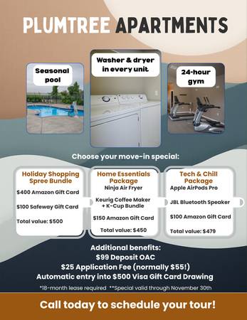 If you're looking to upgrade your lifestyle and personal service from a management company you can trust, you've come to the right place. At Plumtree Apartments we’ll give you the attention and personal service you need every day! We are close to local shopping, restaurants, entertainment, and more! Every unit has warm color schemes and stainless steel appliances. Residents can take advantage of our seasonal swimming pool and dog stations at this pet-friendly, limited smoking community. You will find beautiful features and amenities like modern, open floor plans, granite countertops in select units, stainless steel appliances, dining space and bar style countertops. A/C units, full-size washer, and dryer, walk-in closets in select units, garbage disposal, dishwasher, built-in microwave, ice makers in select units and personal storage on back deck/patio. Each apartment comes with one assigned parking space. All 1st & 2nd Level apartments have 9 ft. high ceilings, and the 3rd Level apartments all have a vaulted ceiling as well. As a Plumtree resident, you can expect to enjoy amenities like monthly community socials, use of the community BBQ grill, free printing and WiFi in the clubhouse and a 24-hour accessible fitness center. I hope this gives you an idea of the great living experience you would have living here at Plumtree Apartment Homes. NO RENT UNTIL JANUARY 1ST, 2026! CHOOSE YOUR HOLIDAY BUNDLE (Tour + Apply same day ONLY!): Bundle A: "Holiday Shopping Spree" $400 Amazon Gift Card $100 Safeway Gift Card Total value: $500 Bundle B: "Home Essentials Package" Ninja Air Fryer ($150 value) Keurig Coffee Maker + K-Cup Bundle ($150 value) $150 Amazon Gift Card Total value: $450 Bundle C: "Tech & Chill Package" Apple AirPods Pro ($249 value) JBL Bluetooth Speaker ($130 value) $100 Amazon Gift Card Total value: $479 Additional Benefits: $99 Deposit OAC $25 Application Fee (normally $55!) Automatic entry into $500 Visa Gift Card Drawing (winner announced Dec 1st) 18-month lease required Special valid through November 30th IMPORTANT: Holiday Bundle ONLY available if you tour + apply same day AND move in within 4 days of application date!Amenities