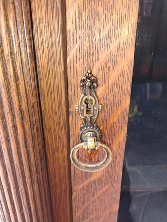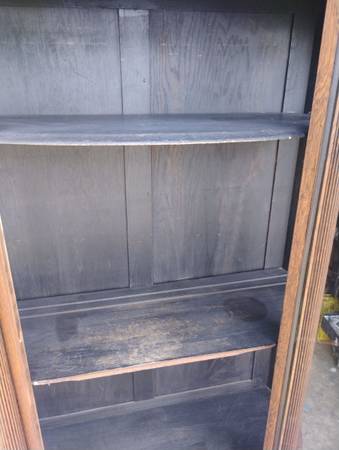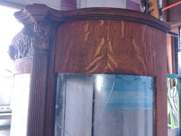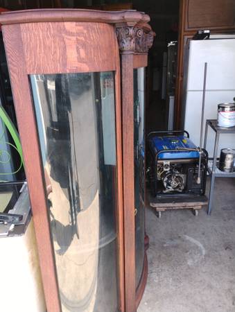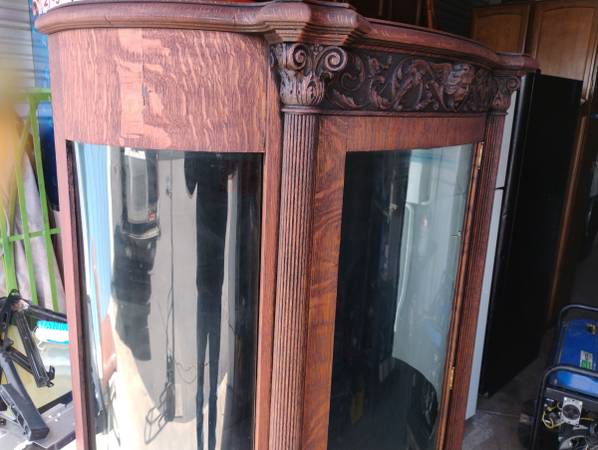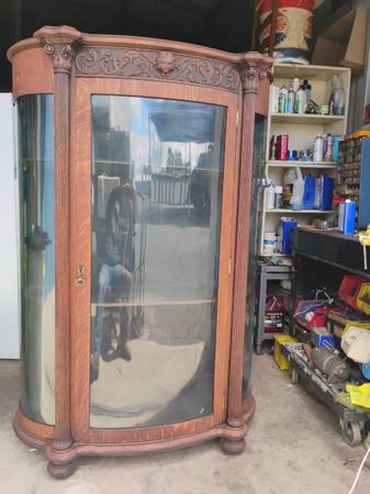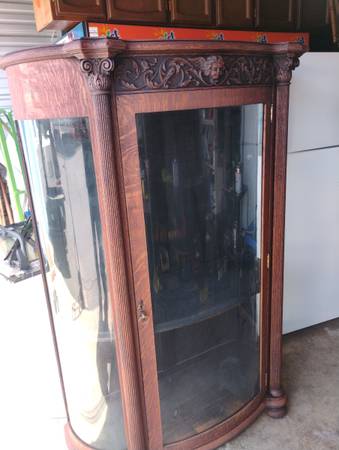 1850s rounded glass curio cabinet. 20 inches deep 66 1/2 tall 44 and 1/2 wide. Beautifully hand carved with cherub front and center three shelves very nice.