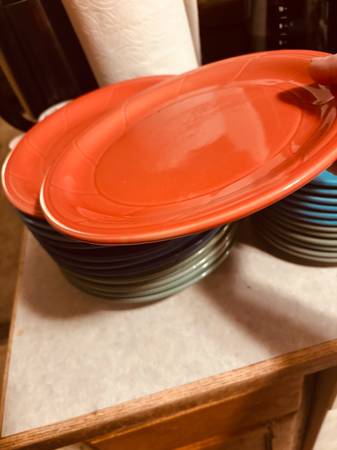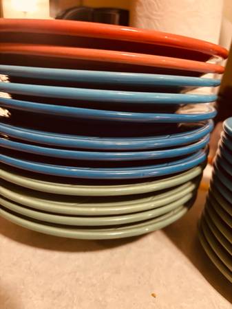 Selling a beautiful vintage set of Crestware stoneware plates in mixed colors (sky blue, teal/green, and tomato red). These are classic restaurant-grade dishes — super sturdy, heavy, and built to last. Perfect for everyday use, vintage kitchen décor, or anyone who loves that retro diner look.