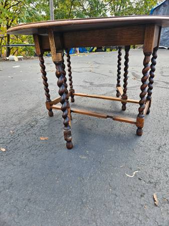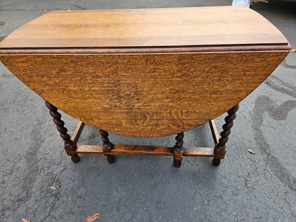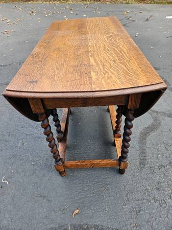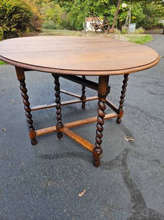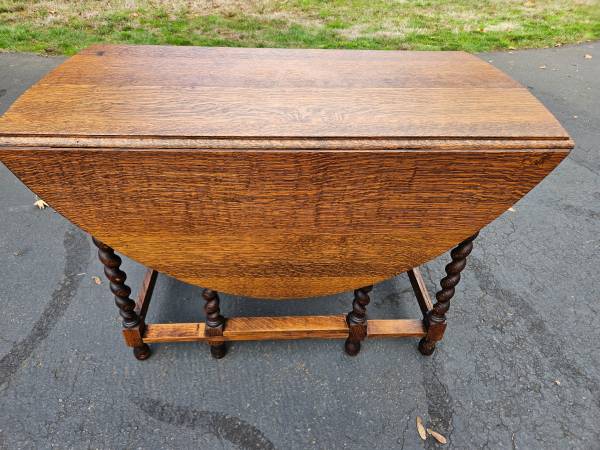 Selling our very nice quatersawn antique oak barley twist gate leg dining table. It is in very good condition and sturdy. CASH ONLY. I will not reply to bogus messages. If it's still posted, it's still available and I will not reply to emails outside of CL. Its 29" Tall, 41" wide. 58" long when sides are up and 21" when down.