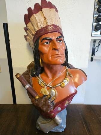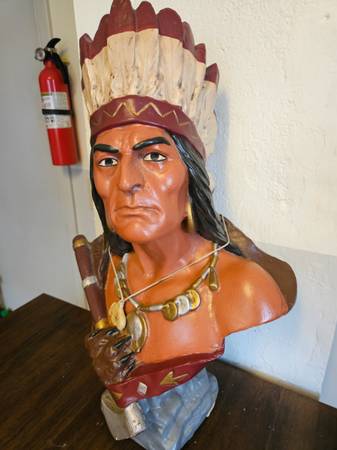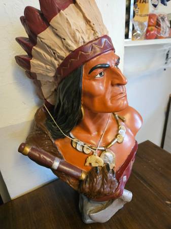 This is a large vintage Native American Chief, from Mid-20th century (likely 1930s–1960s), bust sculpture, standing approximately 21 inches tall and weighing about 8 pounds. Made of plaster or chalkware, this impressive decorative piece features detailed facial expression, feathered headdress, necklace, and pipe.
