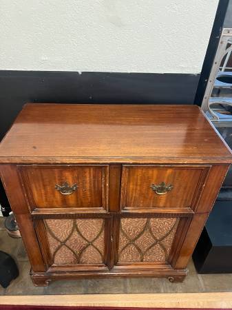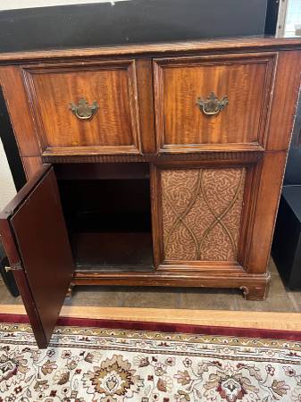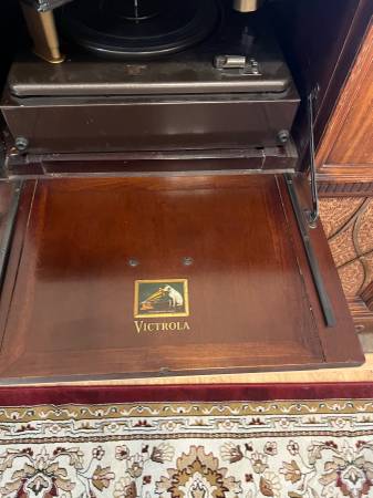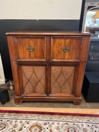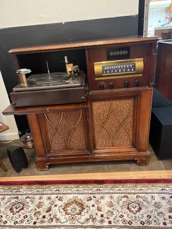 This is a beautiful piece. It is rather interesting in that it has a slide-out record player that can stack and drop several records plus a storage space for records. As far as I know, it still functions. It has not been used in several years.