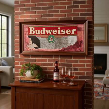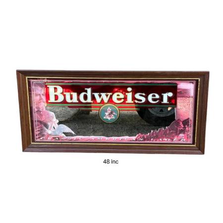 Add some character to your bar, man cave, or game room with this vintage Budweiser wall mirror. Features the iconic Budweiser logo with wood frame and classic detailing.