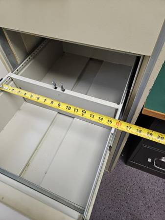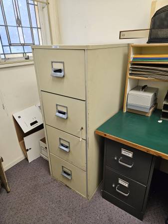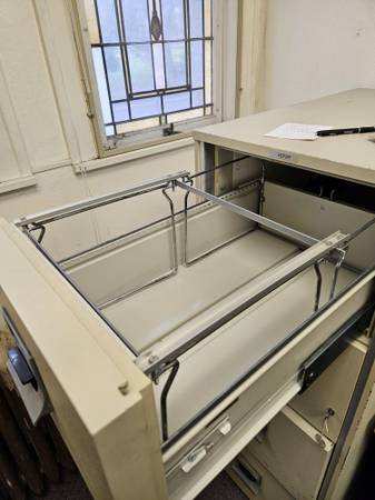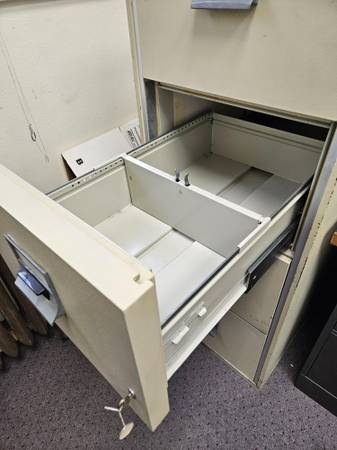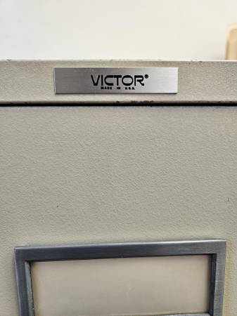 VICTOR legal sized file cabinet. I believe this is a fire cabinet. It is very heavy 500 lbs - 600 lbs. Beige. No dents or scratches. Seems to be in pretty good shape. Comes with a lock and keys, although the lock is kinda janky. The rollers on the drawer will need to be cleaned and lubed - they are a bit rough to open - not like new. I will include four legal to letter conversion racks for the drawers.