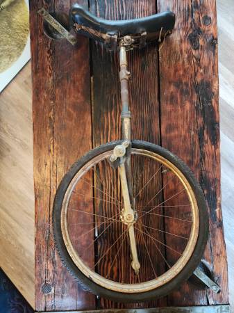 Vintage unicycle with custom made banana seat. Barn fresh with awesome patina and a rad Goodyear tire. Still sturdy and functional if it had new rubber. Put an new tire on it and ride it, restore it, or just hang it on the wall! It just looks awesome!