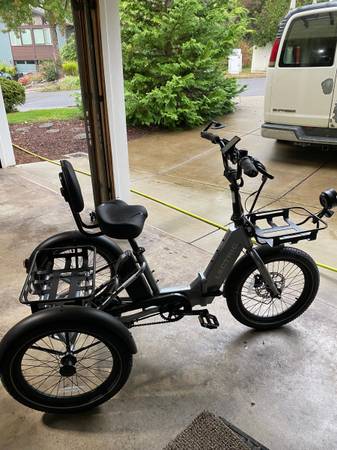 2 Electric Trikes (foldable), used once. Both Grey. LCD display. Front and rear cargo racks. Price per bike $900, or $1700 for both. Paid $1500 each trike. You pickup only. Top speed 17mph. Range up to 70 miles. Payload 415lbs. 1310w Peak motor. Fast charger. Always garage kept. Nothing wrong with the trikes, we have balance issues.