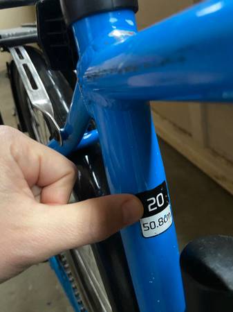 Size is 20"/50.8 cm. I'm 5'6" and enjoyed the fit of this bike. Trek recommends this size for 5'5" to 5'9". Seat post height is adjustable and was comfy for me. Has a specialized saddle on from a past bike that I preferred to the original.