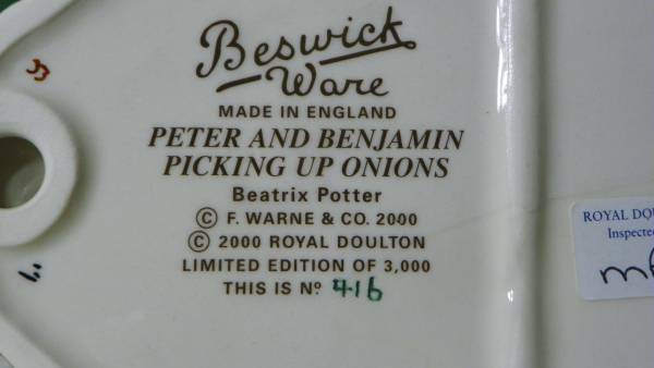Beatrix Potter Tableaux " PETER AND BENJAMIN PICKING UP ONIONS " #416 back stamp BP-8c