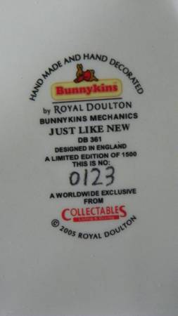 DB361 JUST LIKE NEW , # 123 of 1500. Bunnykins Mechanics & Special Events item, Issued in 2005 in a Limited edition of 1,500 . With Original Box, and COA. Please Phone Calls Only And Local...