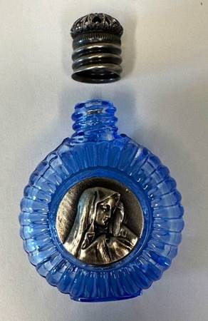 Holy Water Bottle, Blue glass silver metal medallion of the Mary. Christian, Catholic, Orthodox.