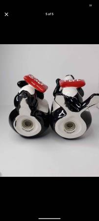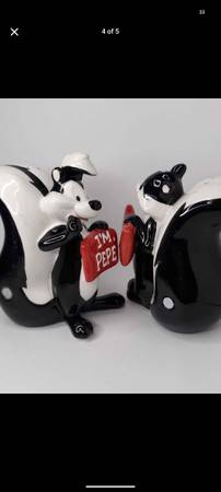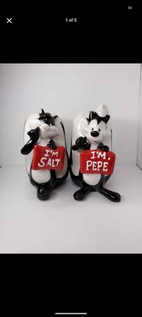 Ceramic shakers with magnet to keep together, H: 3.5 L 3.5. Both still have their rubber plugs, except Le Pew's is loose! No chips! If you have any questions, feel free to reach out. Pickup only,...