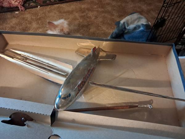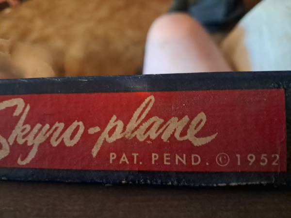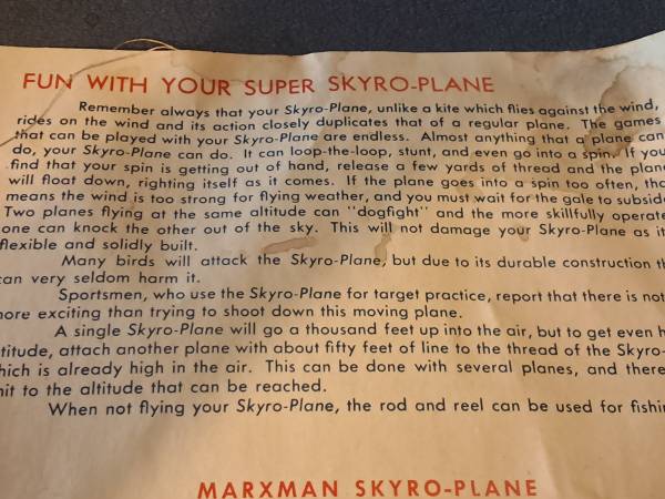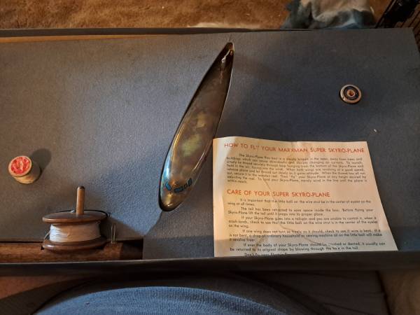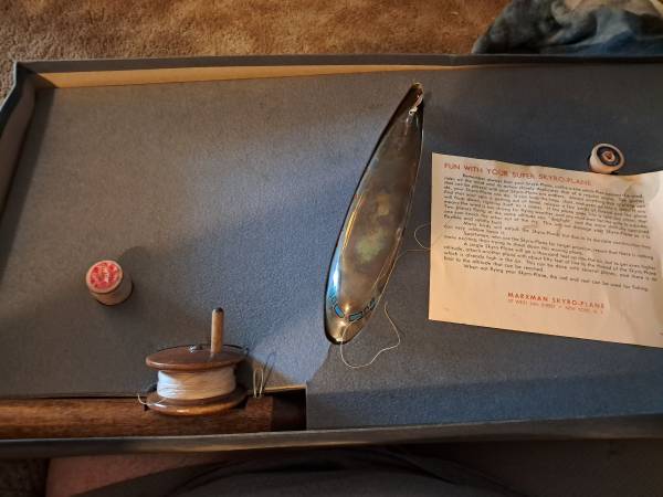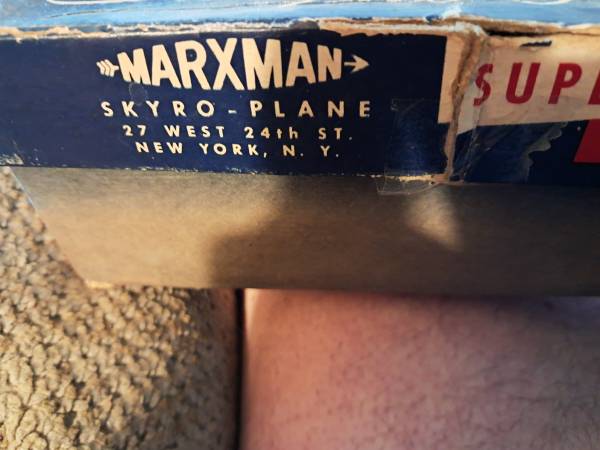 Skyro-plane by Marxman in Original box. Complete with item to make it fly. It doesn't need a motor to fly. If interested text NO CALLS TEXT ONLY