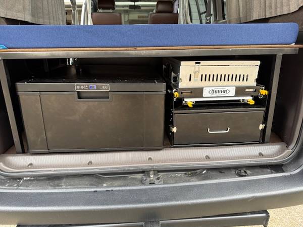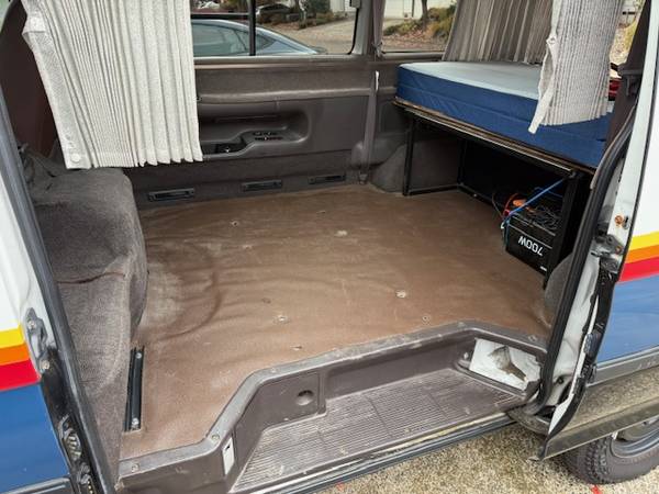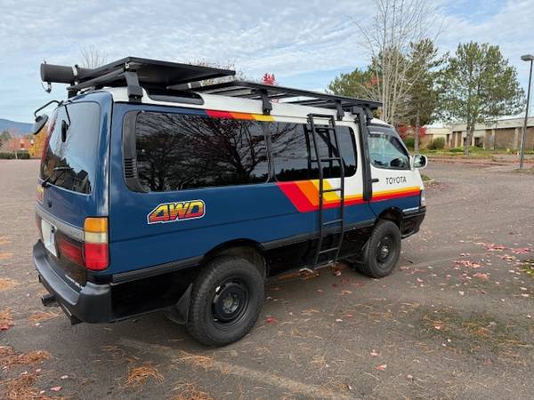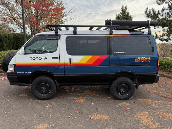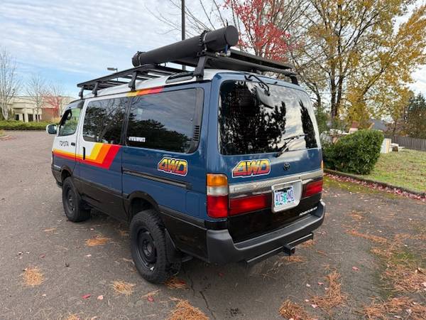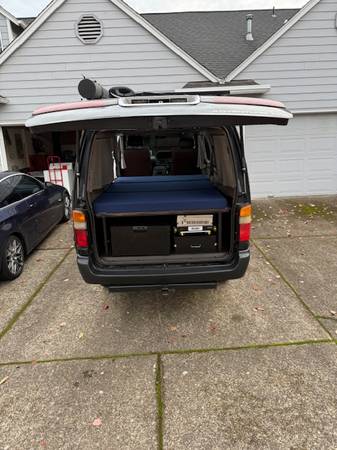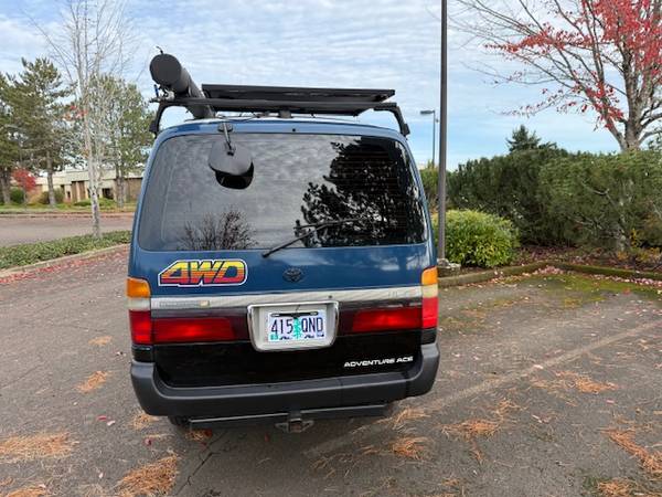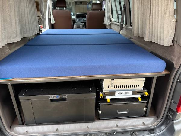 1997 Toyota Hiace campervan in excellent condition. '97 is a good year for a right hand drive vehicle as it has to be 25 years old to be US legal. Bought it on a whim. I have not even had it a year but being retired a hotel room is my preferred way of camping. You will get lots of looks and thumbs up. Photocell on roof feeds spare battery which feeds inverter which currently feeds mini electric refridge/freezer. Has room for other electric devices. Round black cylinder on roof holds water and has a hose for a quick shower. Pretty firm at 34K but will consider offers or trades. Been asked several times and the right wheel drive is easy to adjust to. This came directly from Japan to a previous owner and the drivers manual is in Japanese and I am still learning about it. These are some of the options...about 98K miles, 3 liter diesel, Automatic transmission w/overdrive, three sunroofs-2 are electric, towing hitch, electric curtains, updated screen w/radio, back up camera, I think navigation, etc, propane campstove, cutting board, utensil drawer, Hi-jack, tires in excellent condition... Upholstery, dash, bed, and the rest of the interior in very nice condition. I did remove the rear seats [pictured in my garage] as I prefer the extra space in the back. I am sure there is more that I can not think of. Thanks for looking, Gary Prefer phone call or texts