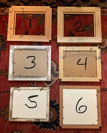 Priced separately. I believe the photos give you a good idea of what you will receive. Number 6 is a square frame, also wood, that measures 12 x 12 and the photo space inside is 10 x 10. Numbers 1 and 2 do not have glass. If you purchase these it is cash only and I will meet you in the Starbucks parking lot across from the IGA in North Albany. Buy all six and you pay $60. My prices are non-negotiable.