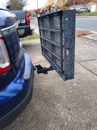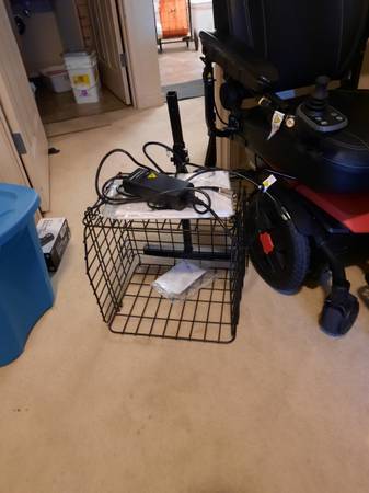 excellent condition power wheelchair. EXTRA equipment includes a hitch mounted folding wheelchair carrier. This is a platform that can be hitch-mounted on the vehical for transport. It folds up when not in use. The ramp folds down so you can use the wheelchair controls to load it. The carrier come with everything needed to mount it on your vehicle, including the drop hitch. Also has a heavy duty detachable wire basket for behind the chair. Great for getting groceries or what ever you need to bring with you. Only a little over a year old. It has 3 different speeds, joystick control, and come with its own charger. It is a very comfortable chair and you can go for about 10 miles or more on a single charge.