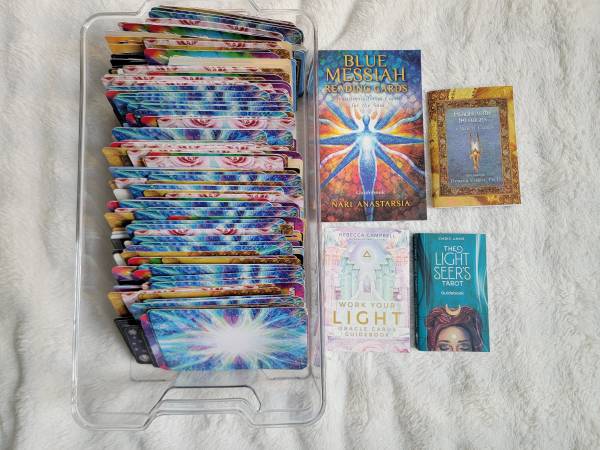 Beautiful collection of over 10 different Tarot and Oracle decks, lovingly curated and stored in a clear acrylic carrying case for easy access and display.