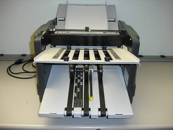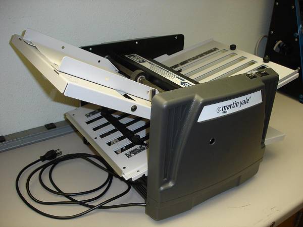 I have a nice Martin Yale 1217A automatic paper folding machine. It’s in excellent condition and ready to go. It does 7 different folds and allows for custom folds; and it does them fast: over 10,000 an hour!