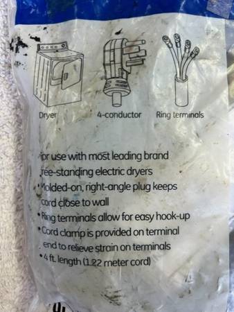 NEW GE Universal 4' 30AMP 4 WIRE 4 PRONG DRYER CORD 4-wire, 4-ft., 30-amp cord Works with most electric dryers Molded-on, right angle plug keeps cord close to wall Ring terminals allow for easy...