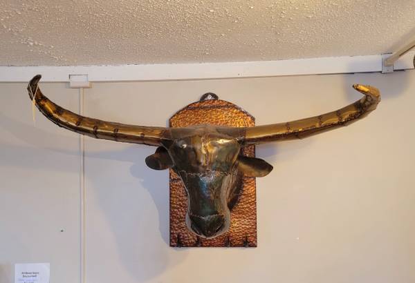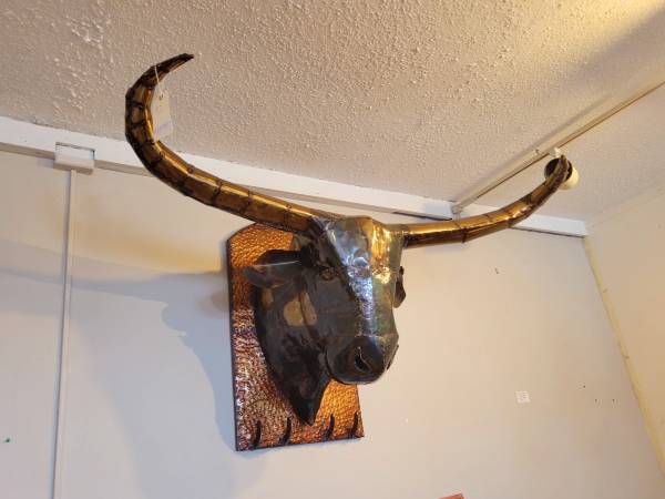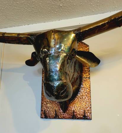 Metal Bull for your home, restaurant, or lodge. Measures 36 inches high x 62 inches wide. It isn't heavy, about 50 pounds or so.