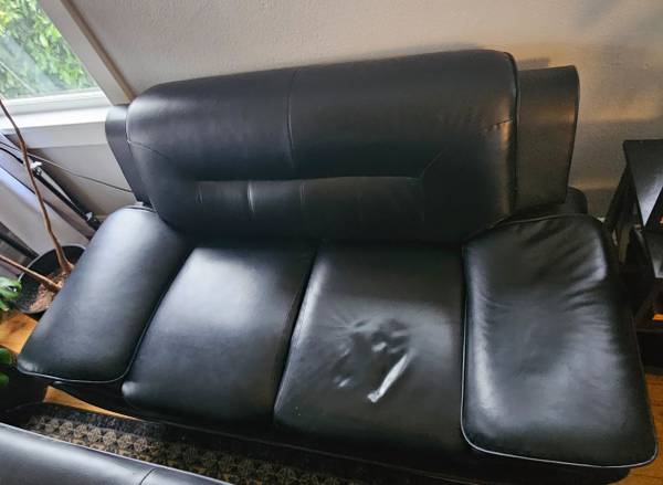 Comfortable modern couch set. Both pieces have wide padded pillow-style armrests that make them great for lounging or taking naps. Faux leather is easy to clean and in overall good shape. Minor cosmetic cat scratch marks on the edges, shown in photos. No tears, no sagging. Smoke-free home.