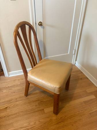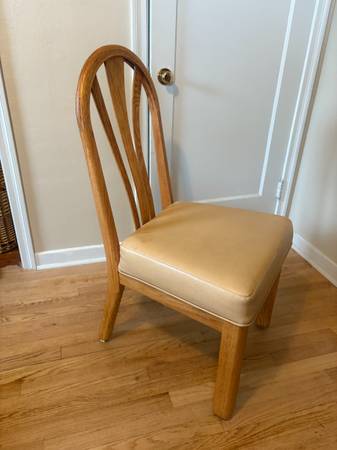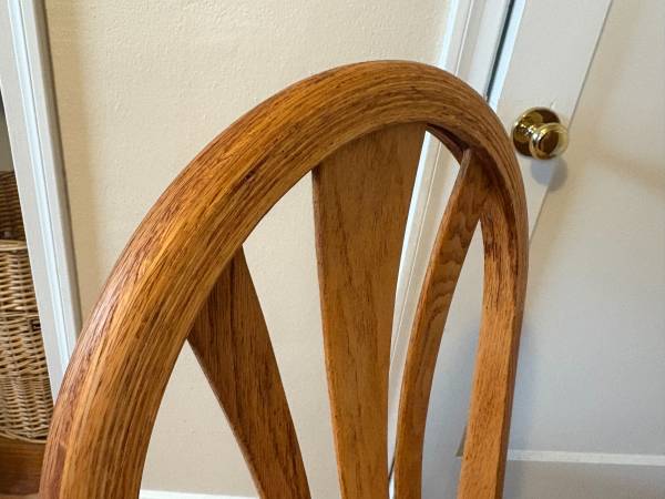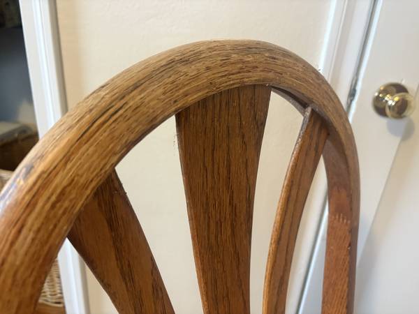 4 Oak dining room chairs! I started cleaning them up and refinishing the set but we got a new dining room table and chairs and the project stalled out. 2 are the original finish and 2 have been cleaned up and refinished with either tung oil or a poly blend, but the 2 refreshes look the same and the 2 original also look very similar to the update, just not as cleaned up (pictures included)