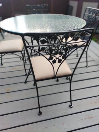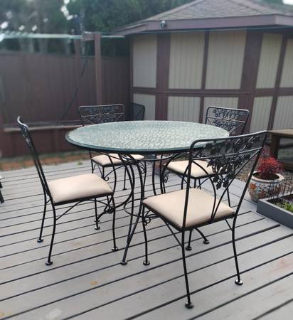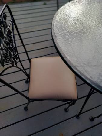 Beautiful Wrought Iron Patio Set Seats are covered with marine vinyl which is resistant to sun and weather. Excellent condition.