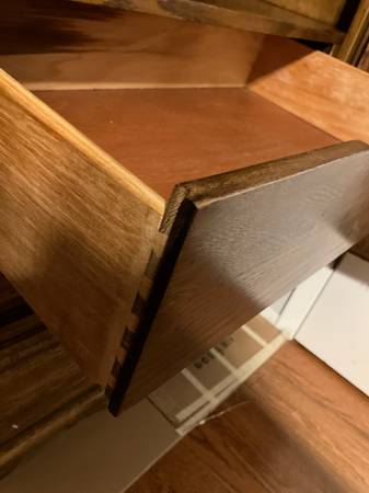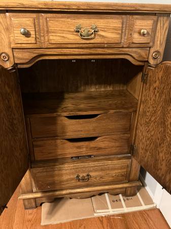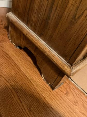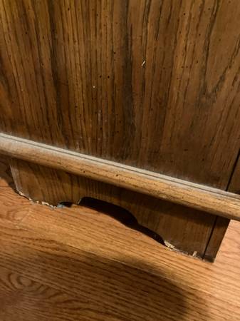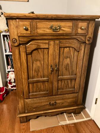 Very sturdy, solid wood door chest or cabinet. Some damage at the feet.