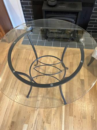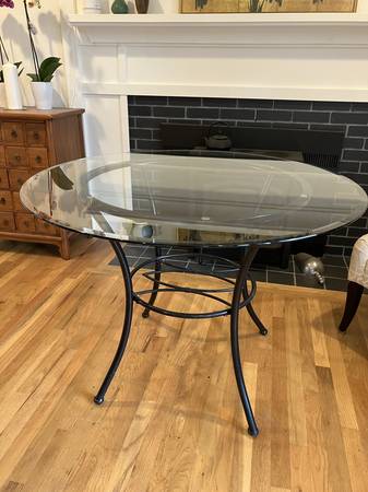 Glass top round table with beveled edges, no chips but some scratches on under surface of glass. Black power coat on Metal base. Seats four comfortably