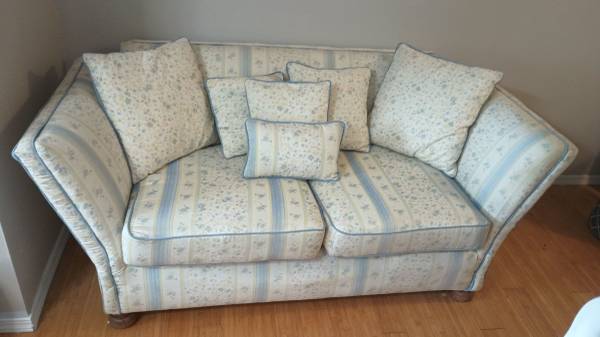 This is an expensive solid couch that has been reappolstered. There is one small tear at the edge of a cushion as shown.