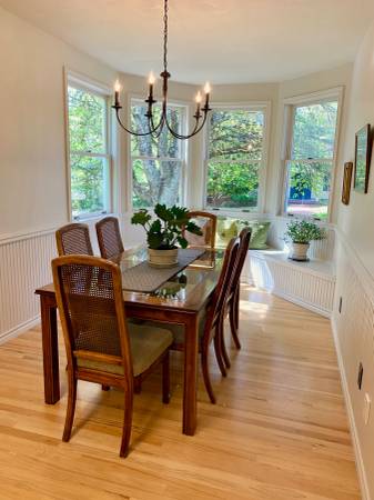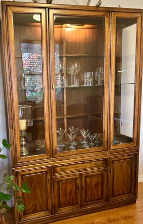 Walnut solid woods and veneers form the frame of this well-maintained Thomasville dining ensemble. Two additional 16” wide table leaves can be added to the underlying, metal support rails to extend the standard 65” length x 40”width table to 97” total length. High-strength table-top glass inserts and six cane-back chairs add a touch of elegance to the entire set that also includes a matching glass-front hutch and under-cabinet (16"x54"x81" total height) for storing and displaying glassware, china and art. Interior cabinet lighting enhances the ambience of this beautiful furnishing.