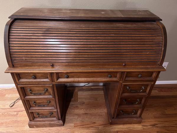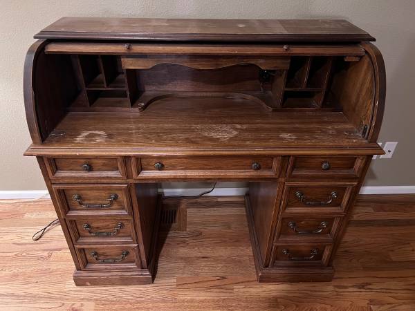 Rare, solid oak roll top writing desk. Drawers slide easily. Fitted with a writing light and electric outlet.