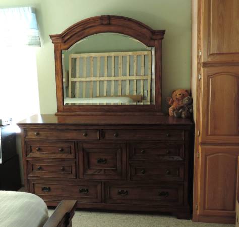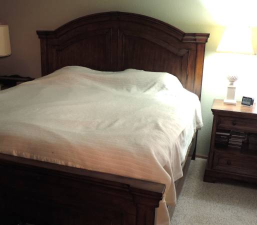 A beautiful bedroom set by Aspen home, Centennial Panel king size bed, master dresser and nightstand. It's stained honey oak that is medium dark so it fits with a lot of different decor. It has a fairly new firm pillowtop mattress that is firm, I had to put a 1" foam topper on it as I'm a side sleeper and the mattress alone was just a little firm. I'm getting ready to move and am older so it's time to downsize. Before being discontinued this set sold for close to $3000. I have another nightstand that I can include it just doesn't match the set. $1200 cash OBO I can assist in moving and do have a truck so moving it isn't a big issue, it would just have to be when it's not raining. I'm also flexible on weather the mattress is included, if you have your own I will sell this one separately. Will have some bedding available to the buyer as well, mattress cover, bedspreads, comforters, etc. thanks for looking and have a great day.