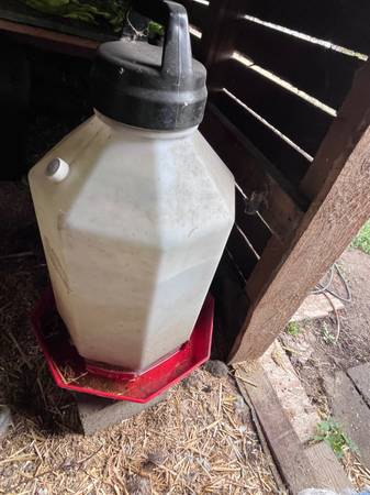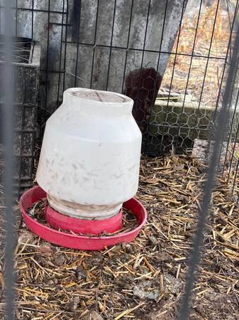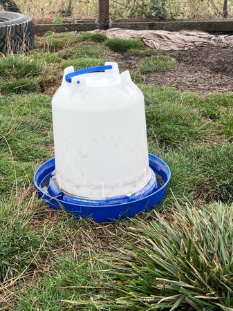 Three separate watering systems. Big red one carries maybe 5 gallons. Round red one carries maybe 3-5 gallons. Small blue one and tiny red one are perfect size for chicks and carry maybe 40-70 ounces.