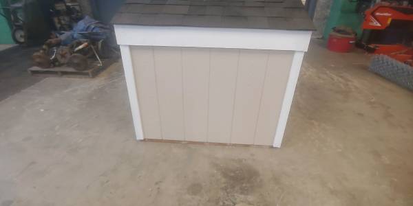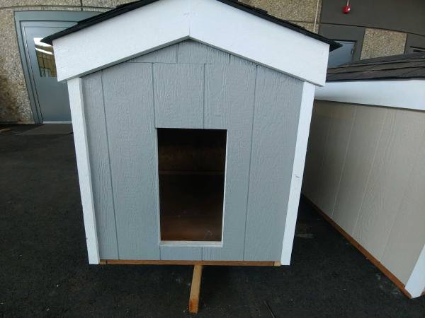 Each home is quality at its finest. . .The bottom consists of pressure treated 2" X 4" wood to resist rot and to elevate the ½ plywood floor off the ground to keep pets cozy. The frame consists of 2 X 2 members and a covered with T1-11. They are also are trimmed with 1" X 2" exterior grade corners, fascia and soffit trim. In addition, the exterior has primer coat and two finish color coats. The pet houses are available in grey and tan. Lastly, the ½ OSB roof sheeting is covered with 15lb. felt and finished off with architecture charcoal colored asphalt shingles.