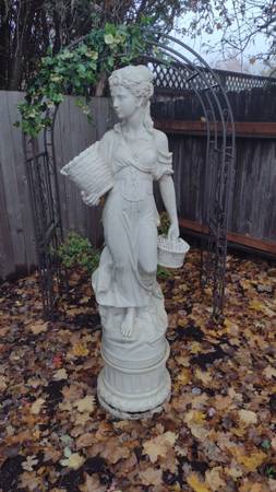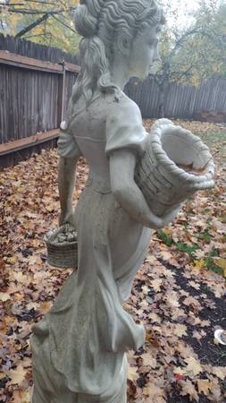 Up for sale is a beautiful stone or cement statue of a woman with baskets. 67" with pedestal.