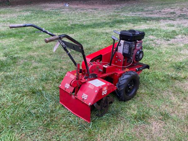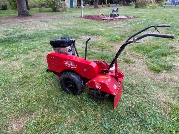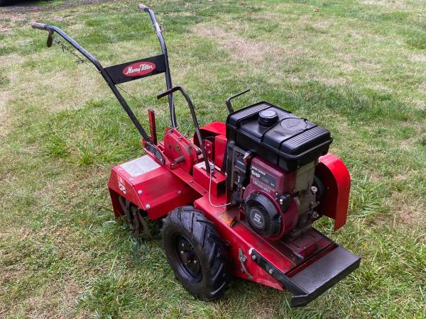 Merry Tiller Rototiller. Power wheels driven with 3 forward gears and reverse. 5HP motor. 21" tiller width. Outside tines are removable. Runs. Call or text, cash only.