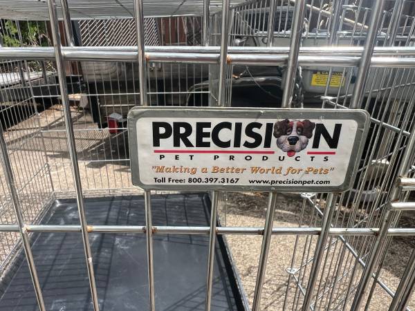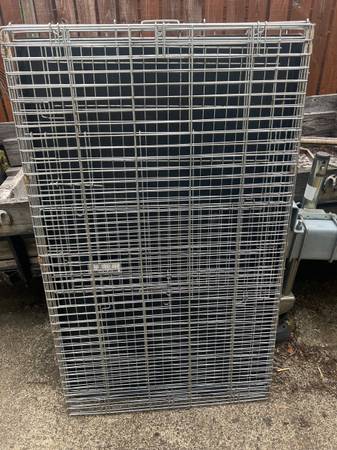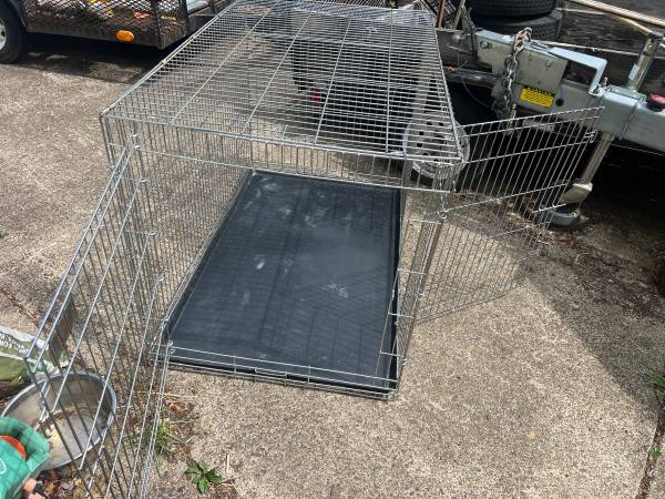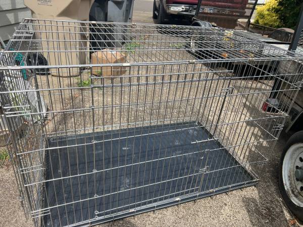 Wire crate with plastic tray underneath. Folds flat when not in use. Good for animals. 48.5” long x 29” wide x 32” high. Two access doors. A little rust but not much