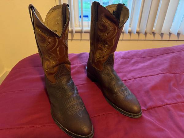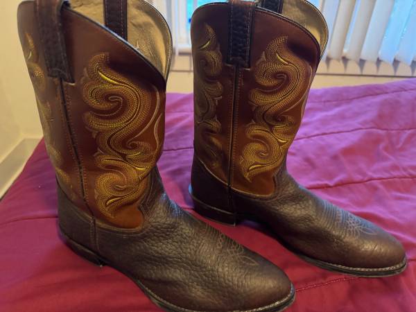 Double H R toe western work boots #DH4417 for sale. Are brown and mustang rust (yellow) in color. Size 14D. Have a 12.5 inch shaft that measures 15.5 inches in circumference. The western heel is 1.625 inches high. Has a Goodyear welt and leather lining. Only been worn a few times, but does have some cracks in the piping. $100 or best offer.