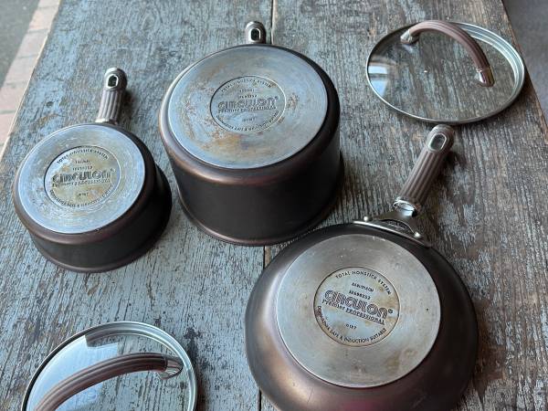 Circulon Cookware in very nice condition. Includes 1-quart saucepan with clear glass lid, 3-quart saucepan with clear glass lid, and 8" fry pan. All three have nice non-stick coating and stay-cool...