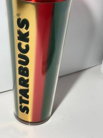Starbucks Holiday 2024 metallic red green gold stripe cold cup tumbler red shimmer dome lid $25. Reduced to $20!