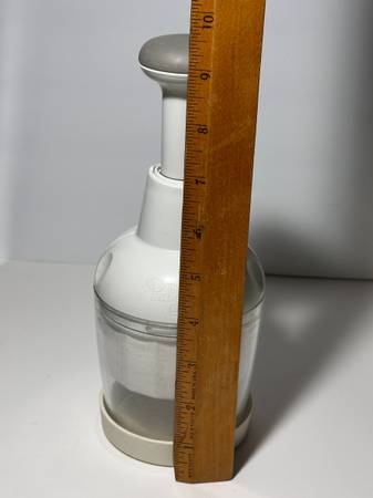 - It uses a unique stainless steel blade that rotates every time you press it, delivering consistent cutting results with every use. The plunger has a soft top to make chopping food comfortable, and the flexible cap doubles as a storage cover and ideal prep surface for small quantities.