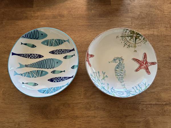 Two 9" Papart Pasta Bowls in excellent condition. One is a fish pattern and one is a seahorse pattern. More info: * Width: 9 in * Height: 2 1/8 in * Crafted In Turkey * Microwave Safe, Dishwasher Safe
