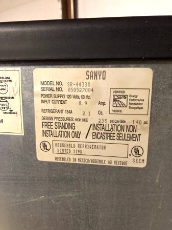 Sanyo SR-4433S 4.4 cu. ft. compact refrigerator Height -33.75 in Width -18.63 in and Depth 21in Capacity 4.4 Cu. Ft. Adjustable levelers