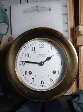 The brass Atlantis 8-Day Wind Ship's Bell Clock houses a key-wound, 11-jewel ship's bell clock movement with bell silencer switch. Everything about this clock rings true to the nostalgic mariner who enjoys the weekly routine of key winding and the charming sound of the chiming bells. The screw bezel allows easy access to the movement for winding and any other adjustments. The clock case is created from solid, forged brass that is hand-polished and flawlessly lacquered.