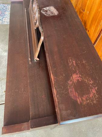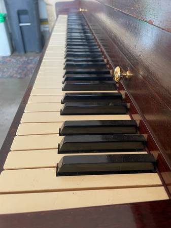 Free upright piano with stool. U-haul. As is. All keys work except the lowest C. Plays well. Pedals work. Varnish has damage and cracks. Good learners’ piano.