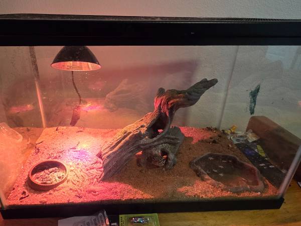 10 gallon tank. Two bowls. Lamp. Hide. Gecko. One hundred for everything.