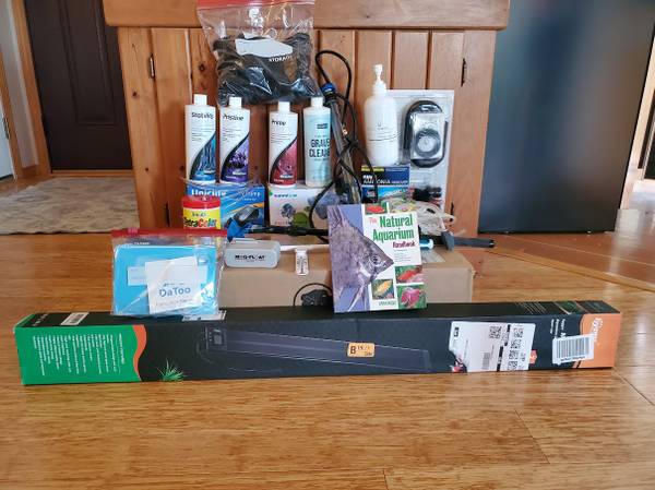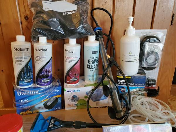 - Several opened containers of Seachem water conditioner, neutralizer, gravel cleaner, etc. (purchased January 2025)