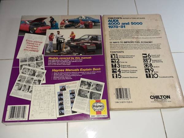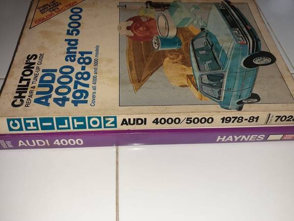 Haynes Audi 4000 1980 - 1987 & Chilton's Audi 4000 & 5000 1978 - 1981 Manuals Haynes manual is in very good condition, Chilton's manual has some more wear to it. Both are in good, solid,...
